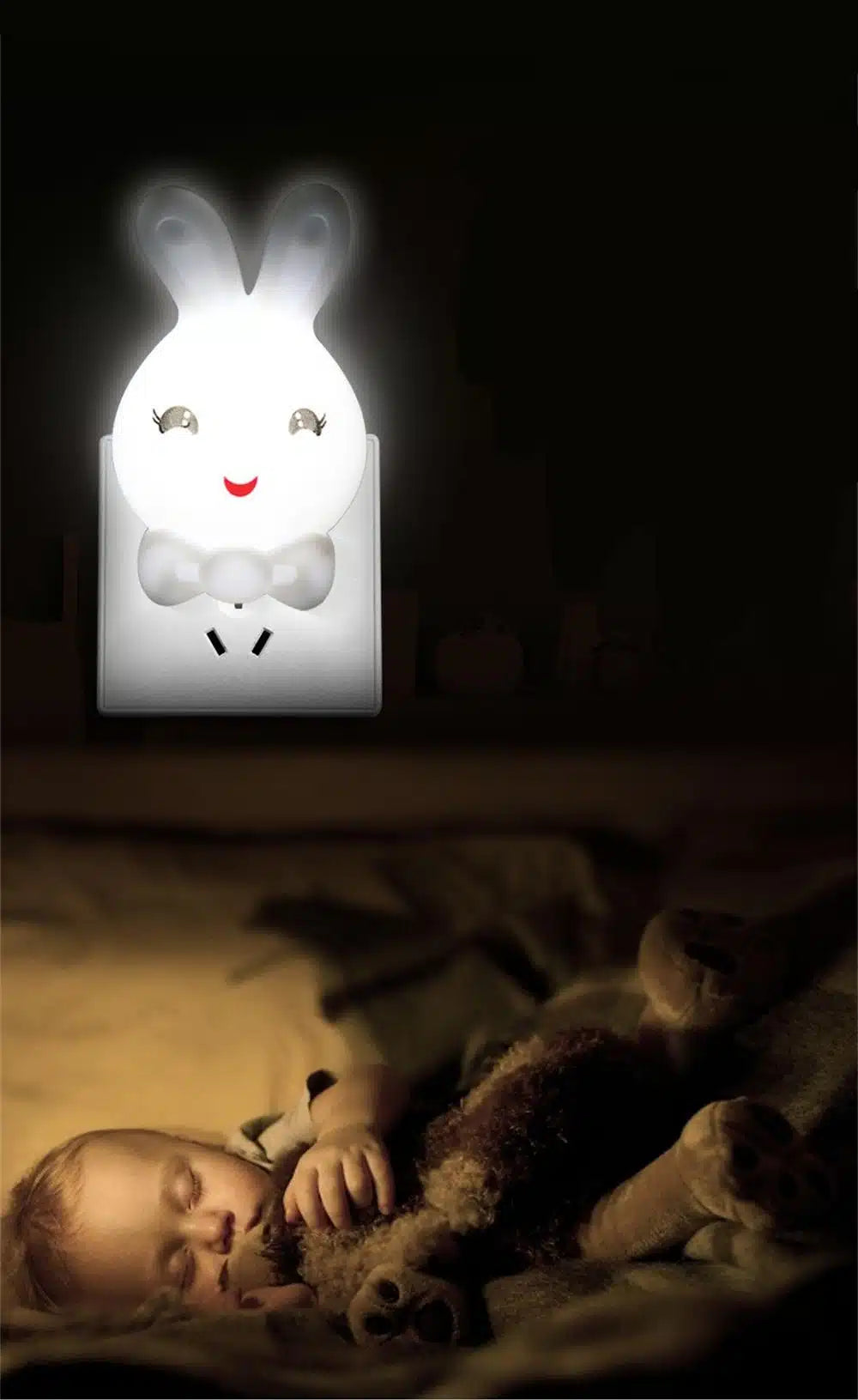 Maak de slaapkamer gezellig met dit LED stopcontact nachtlampje in konijnvorm en tover een glimlach op het gezicht van je kind.